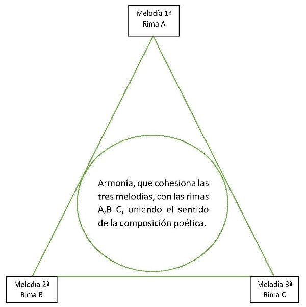 Observamos, pues, que, básicamente, cada Jotabé está formado por once versos y cuenta con tres rimas distintas, una para cada una de las tres primeras estrofas; Si Tagore comparó la música (que siente lo infinito en el aire), y la poesía (que lo siente en el aire y en la tierra al mismo tiempo, porque su palabra tiene el sentido que camina y la melodía que vuela), vemos que esta propuesta Jotabé hay tres melodías y una armonía: cada una de las tres primeras estrofas «vuelan», con su rima (melodías), que vienen a confluir en la última estrofa (proporciona la armonía), con los tres últimos versos, la estrofa llamada «terzo», formando, ahora, una armonía perfecta, al simultanear las tres rimas (o melodías) que se han utilizado, con lo cual, queda vinculada cada Rima, fusionándose en un lazo de unión que da sentido a la obra, lo que podríamos llamar en términos musicales «un lied magnífico», unos temas melódicos sustentados en una armonía sólida, llena de ingenio y saber hacer.