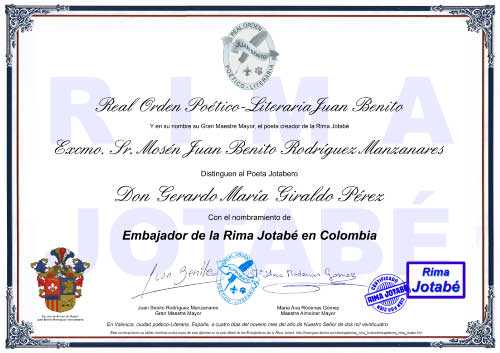 | Los Diplomas de Embajador/ra de la Rima Jotabé tiene validez mientras se encuentren expuestos aquí, en esta sección de Embajadores de la Rima Jotabé. |